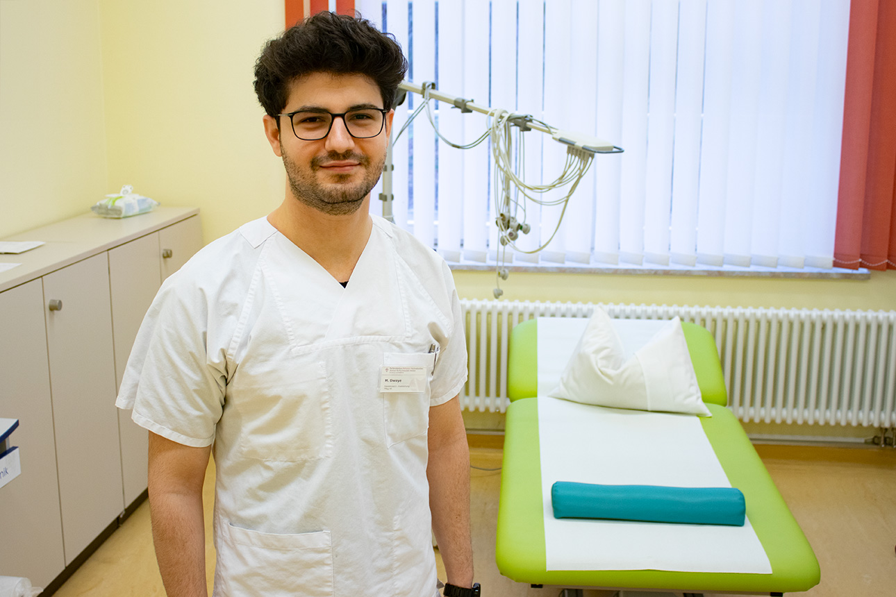 Auf der Suchtstation S2 ist Mohamed Dwaye eingesetzt, er übernimmt hier Aufgaben als Pflegehilfskraft und hospitiert bei den täglichen Aufgaben des ärztlichen Teams. „Unter den Kollegen fühlt es sich an wie eine Familie. Und die Dankbarkeit der Patienten, wenn sie zufrieden sind mit ihrem Behandlungserfolg, das macht mich sehr zufrieden und motiviert extrem.“, erzählt er uns.